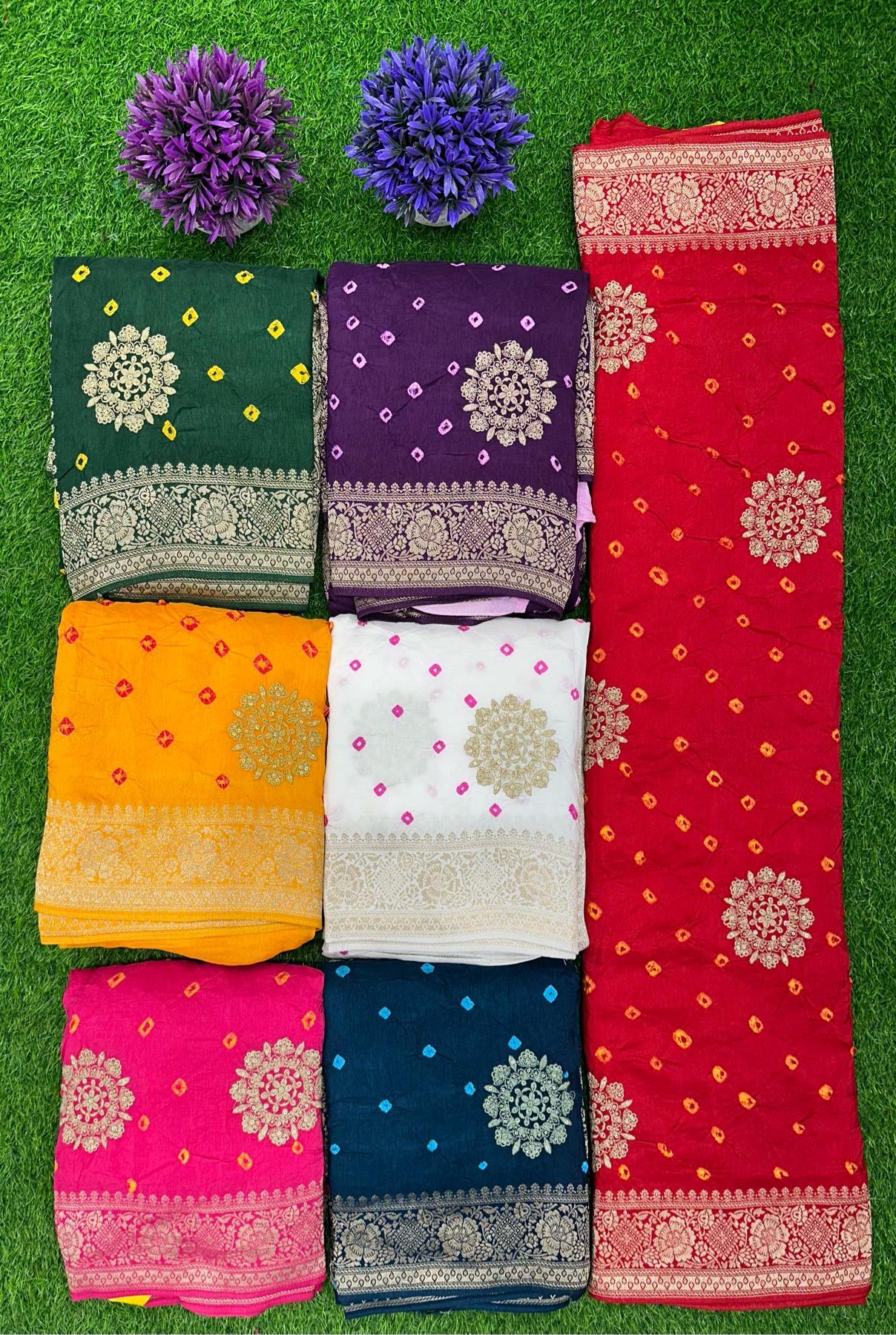 A timeless drape crafted from 100% Viscose Silk, featuring traditional Bandhej patterns that highlight rich heritage and artistry.