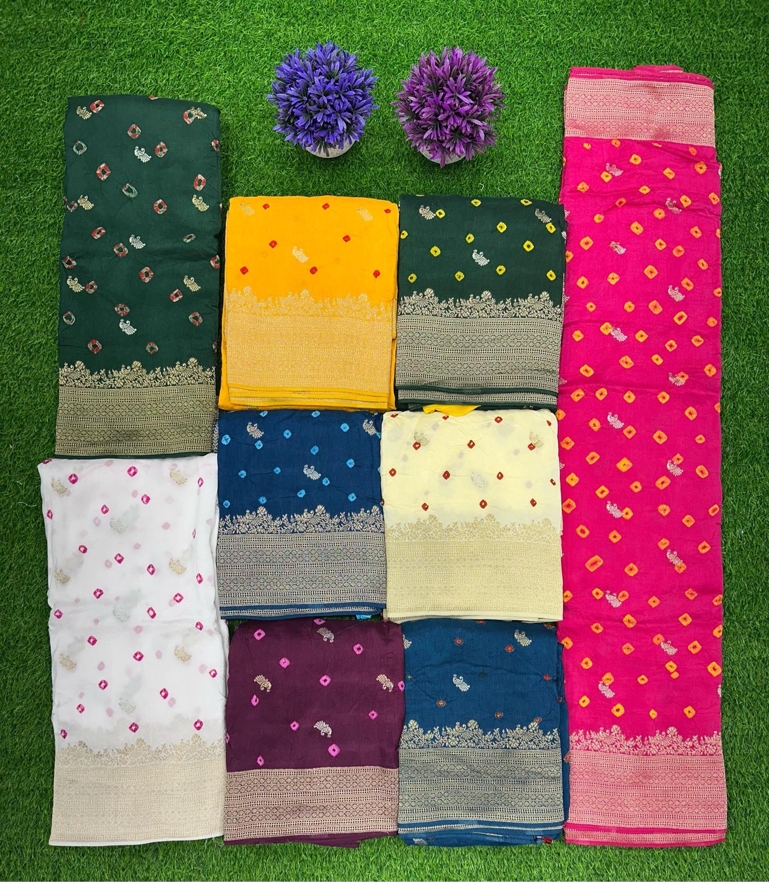 A timeless drape crafted from 100% Viscose Silk, featuring traditional Bandhej patterns that highlight rich heritage and artistry.