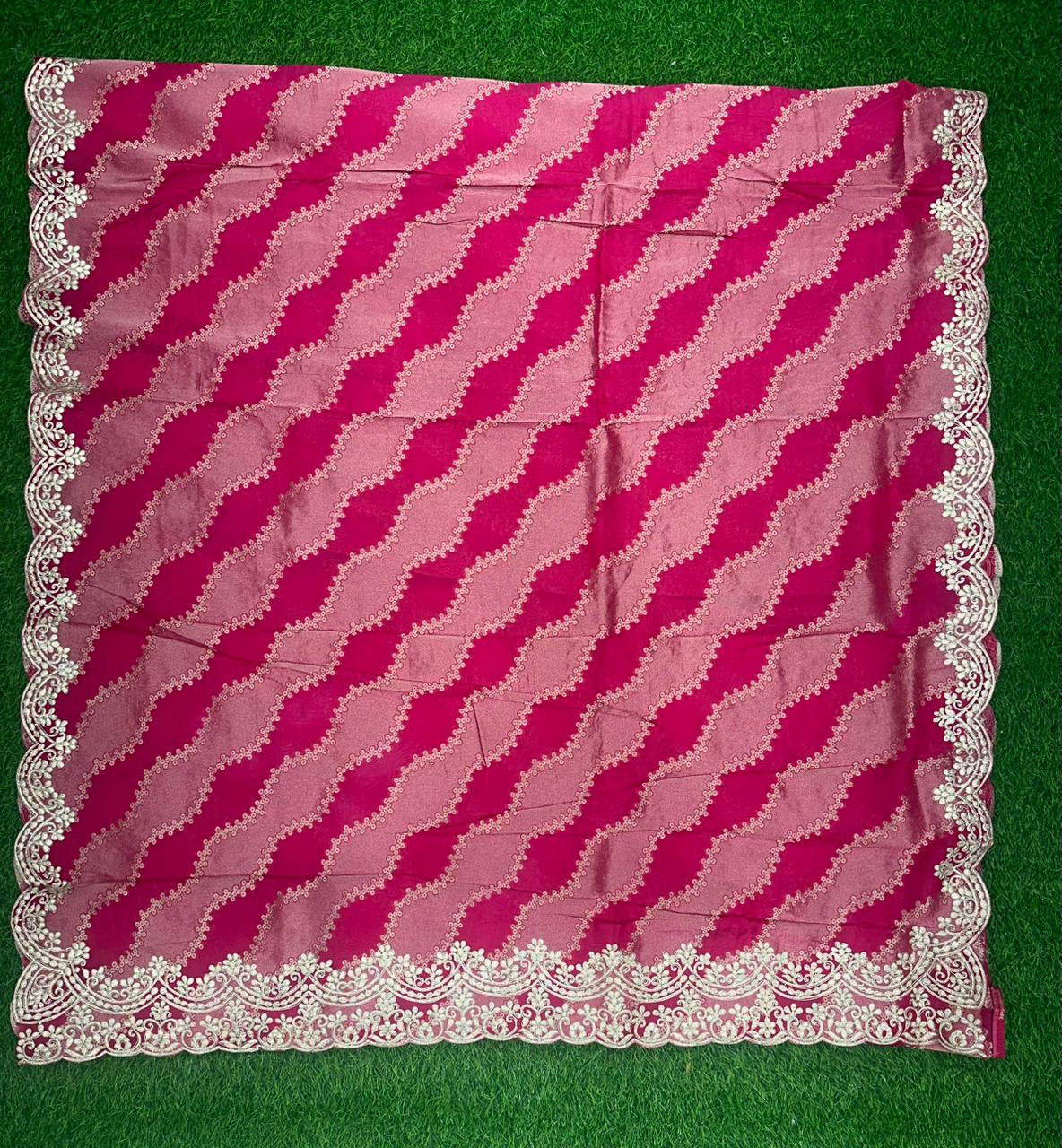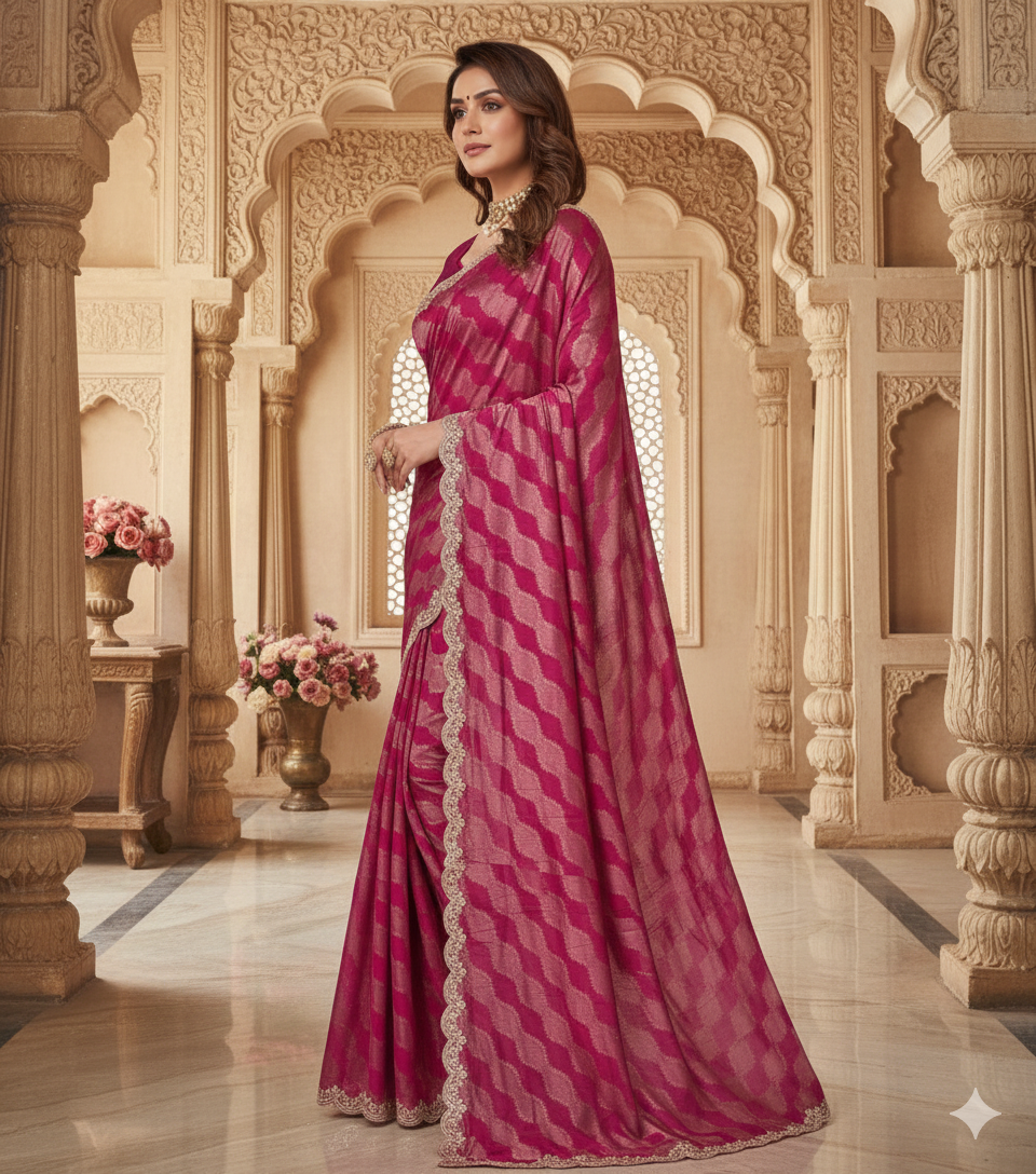 An elegant saree woven from 100% Viscose Silk, enhanced with intricate Gotta hand work that adds festive charm.