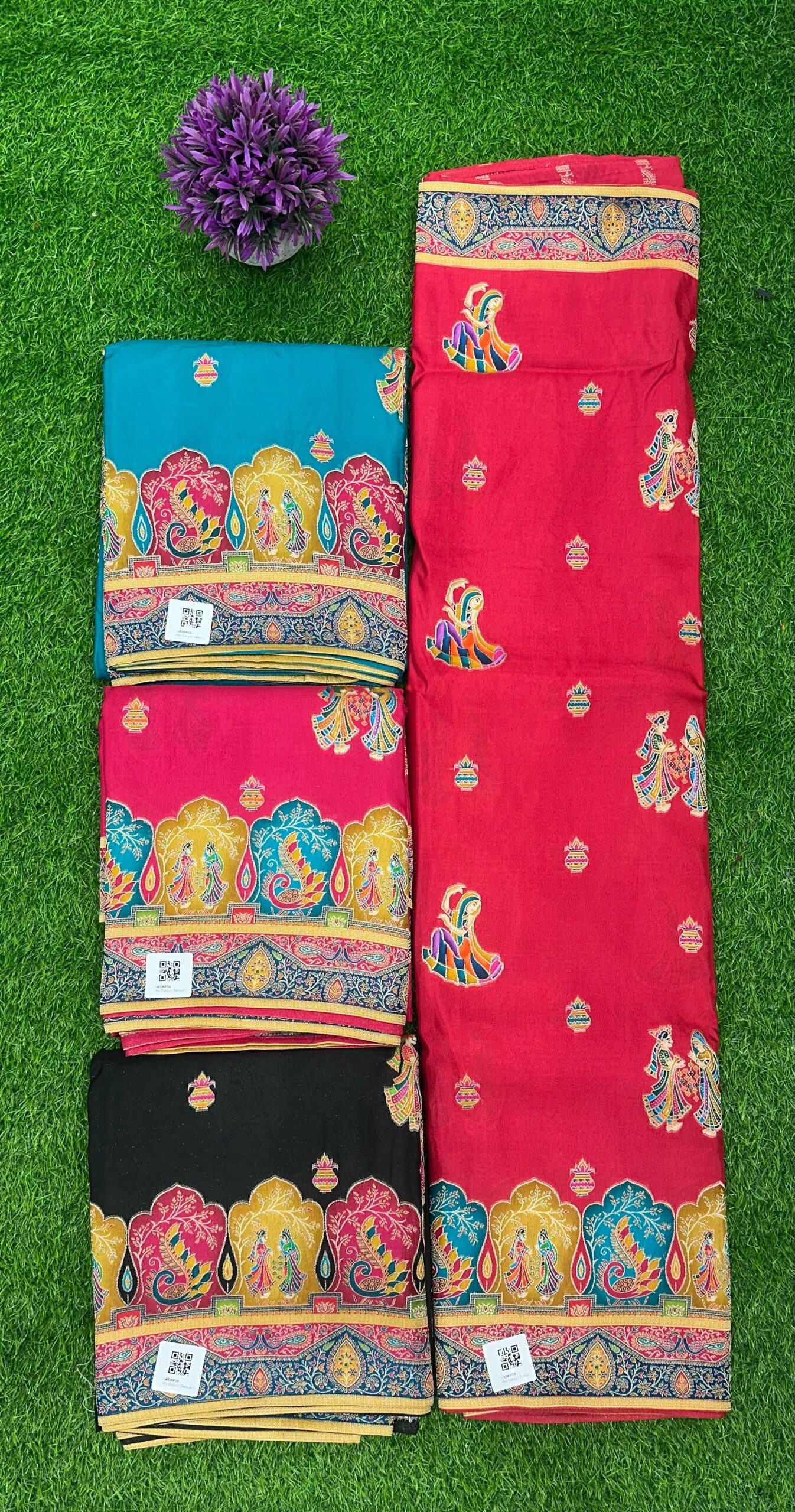 Crafted from 100% Viscose Pashmina Silk, this saree offers a warm, soft texture with artistic position prints.