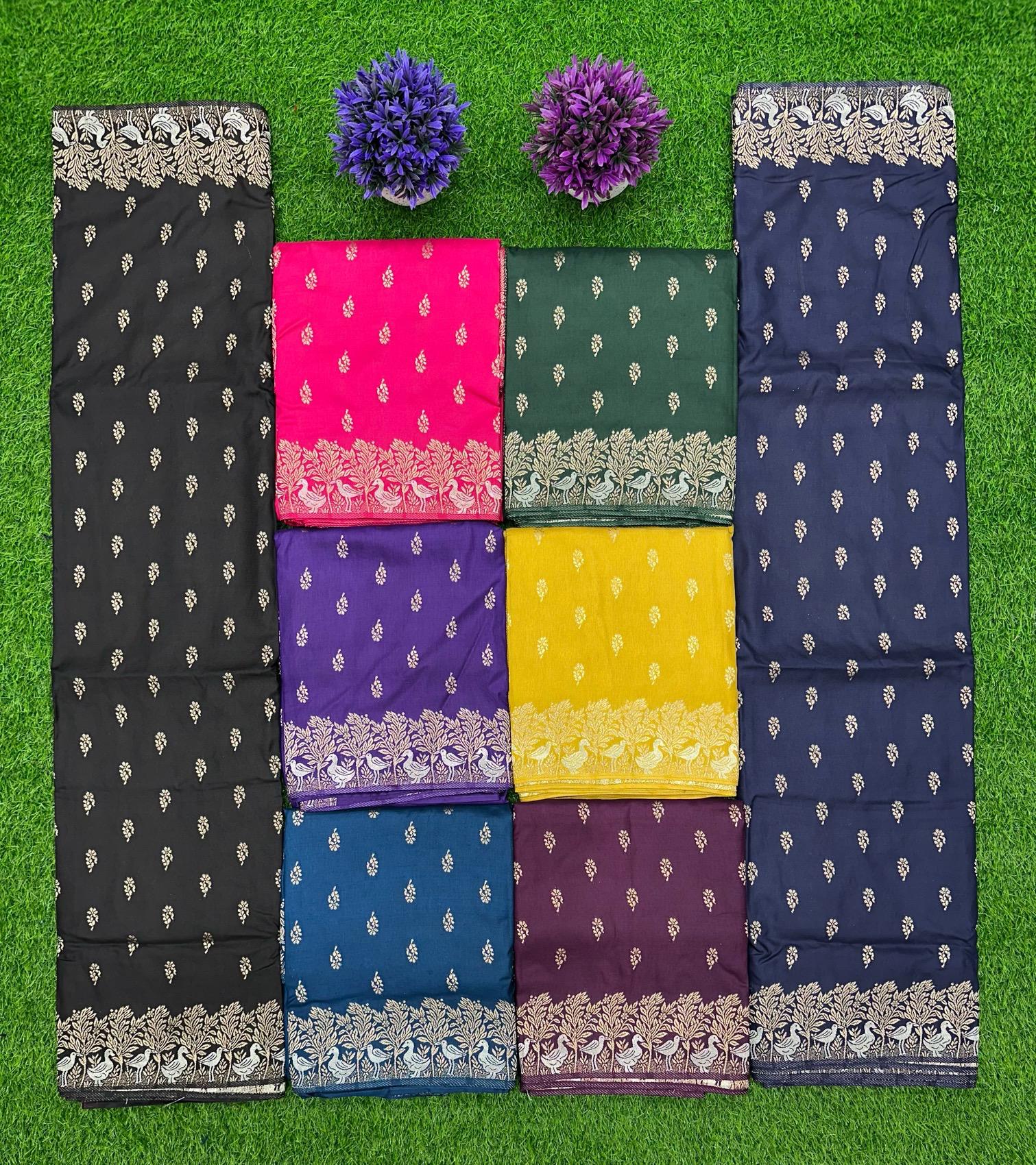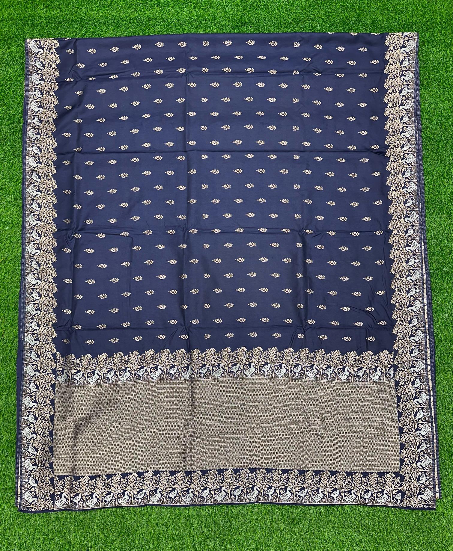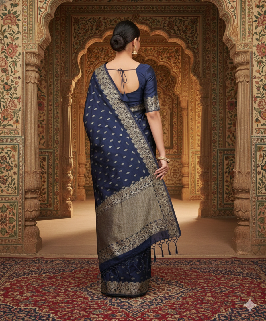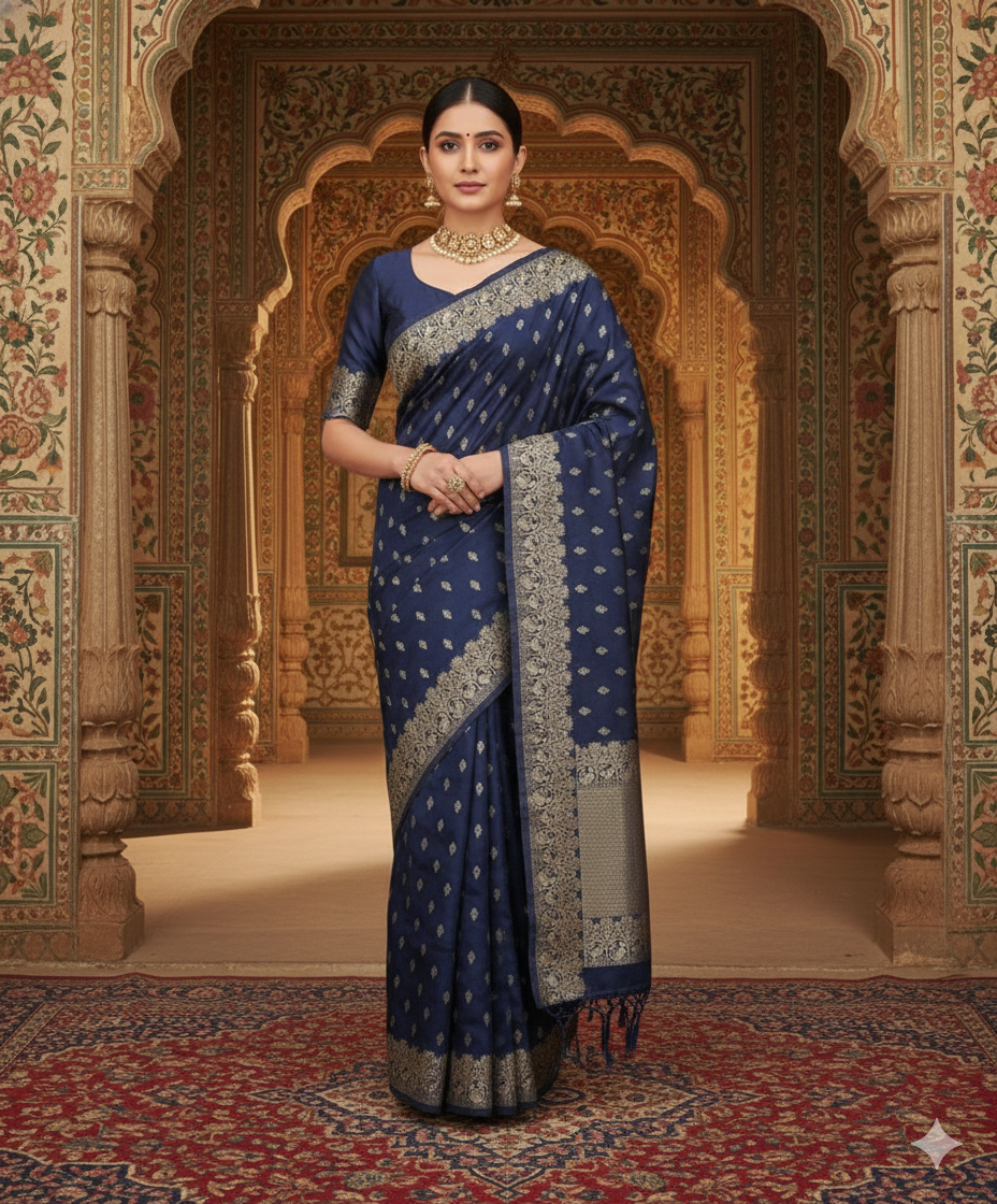 A luxurious saree crafted from 100% Viscose Russian Silk, known for its natural sheen and fluid drape.